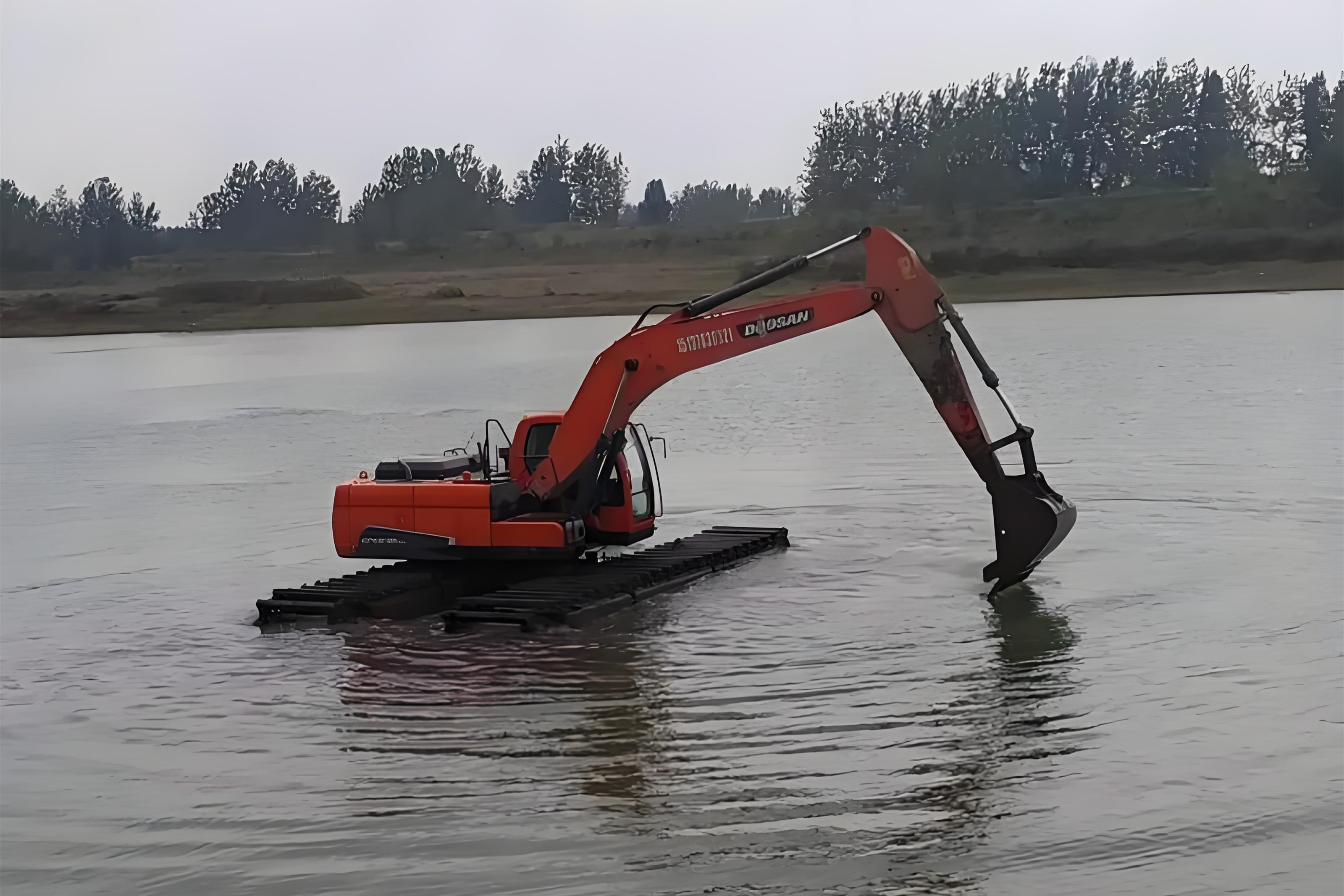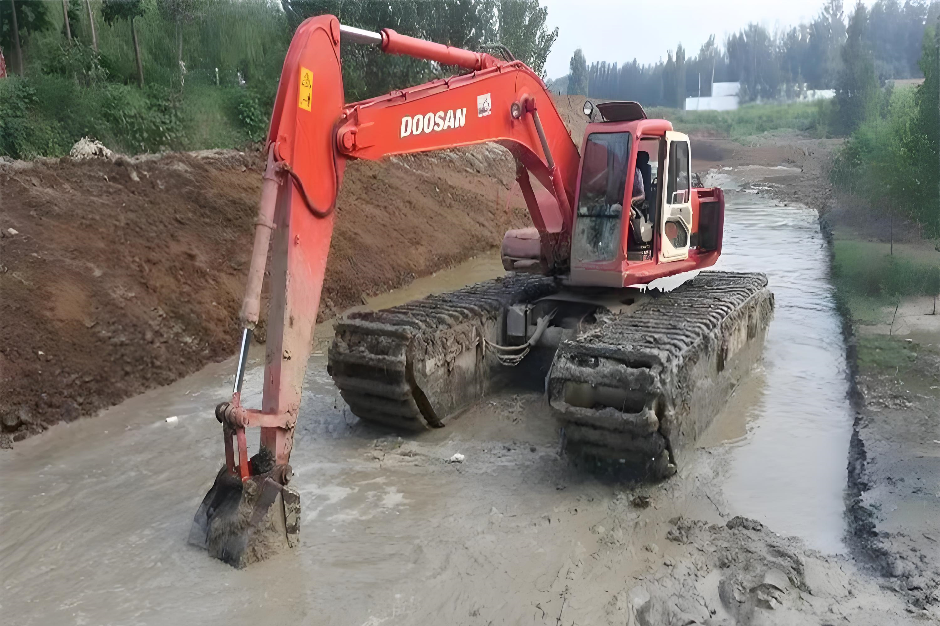 還有些特殊情況會(huì)用到水陸兩用挖掘機(jī),這種設(shè)備的履帶像船一樣寬大,甚至能在淺水中漂浮作業(yè),不過(guò)成本較高,一般在超深淤泥區(qū)才會(huì)啟用。